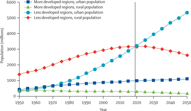 One of the most significant trends we will all need to manage globally is the increasing urbanization of the world. In vast droves, especially in the developing world, people are showing up in cities, looking for work, food, water, opportunity. Here’s a chart from the UN: