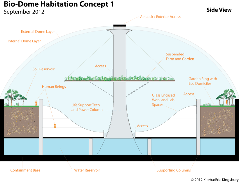 This concept involves a dense, protective base, coupled with a two-ply sealed dome, supporting vegetation, farming, air, water and all kinds of life. There is a water reservoir at the base and soil in a circular ring, where oxygen-producing plants would grow and humans could live in a jungly paradise. The central column supports the dome and houses all the machinery that would keep the overall life support system working in equilibrium. There is even a suspended farming area.